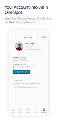 · Maps — Search for Duke buildings by name, pinpoint them on the map and see your relative location, and zoom or pan across the map using the multi-touch interface