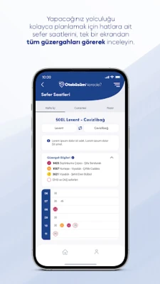 Hat adıyla arama yaparak otobüs hatlarının ana ve depar güzergahlarını inceleyebilirsiniz. Hat detay sayfasından görmek istediğiniz güzergahı seçerek, o güzergahta hangi durakların olduğunu görebilirsiniz. Otobüslerin anlık konumlarını izleyebilir, hangi duraktan hangi güzergaha ait otobüsün geçtiğini depar güzergahlara özel renklendirme ile kolayca ayırt edebilirsiniz. Dilerseniz harita görünümüne geçerek hattın tüm güzergahlarını harita üzerinden de inceleyebilirsiniz. Bunun için haritanın sol üst köşesinde bulunan filtre ikonu ile görmek istediğiniz güzergahları aktif etmeniz yeterli.